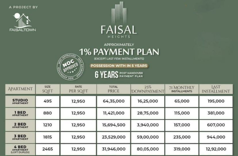The prices of apartments in Faisal Heights are competitive, starting from affordable installments and going up depending on the size and location within the project.